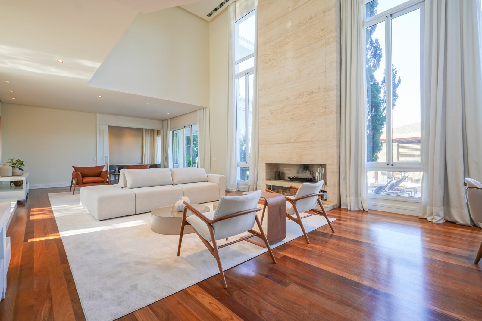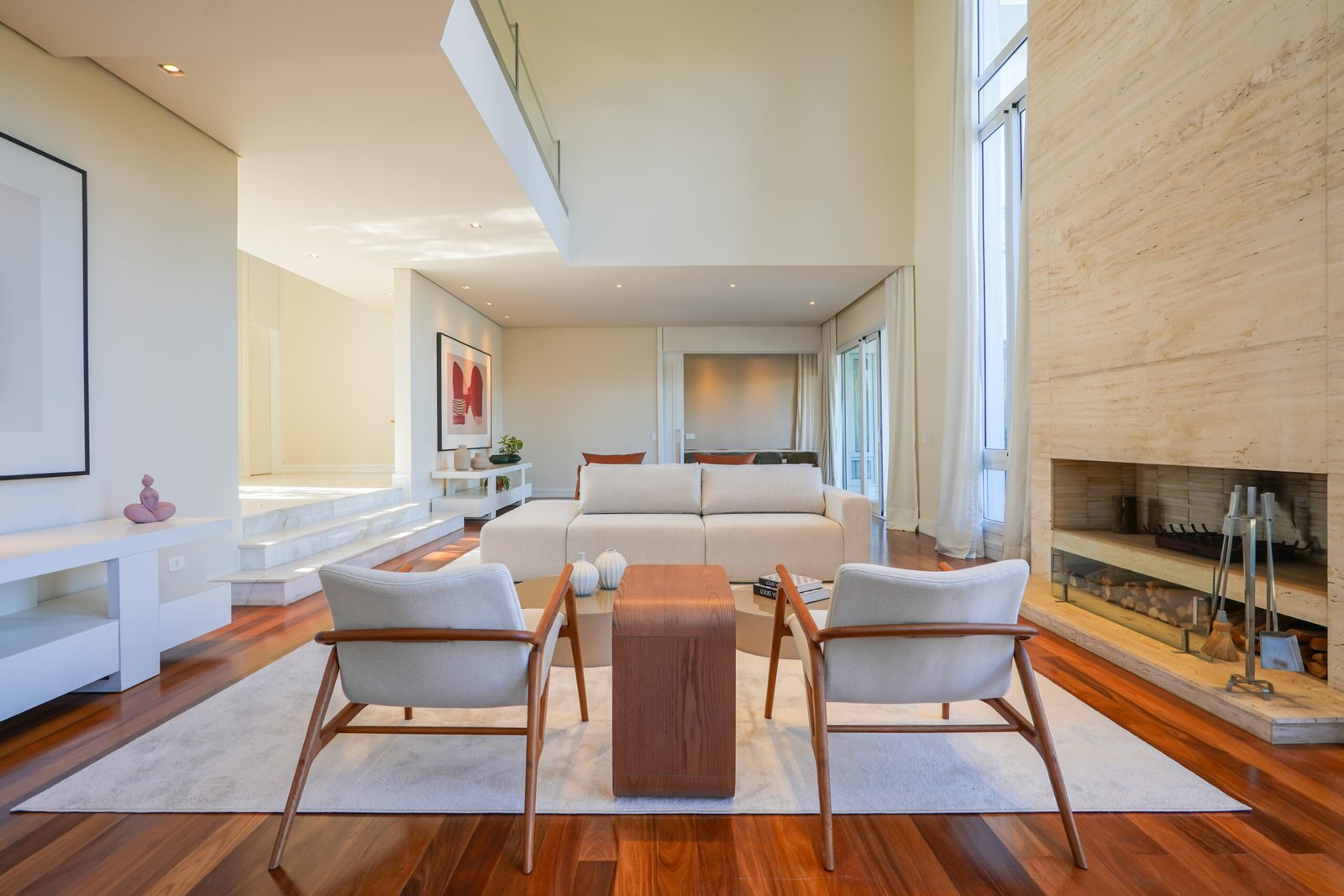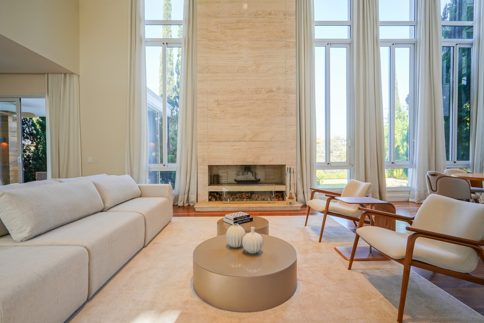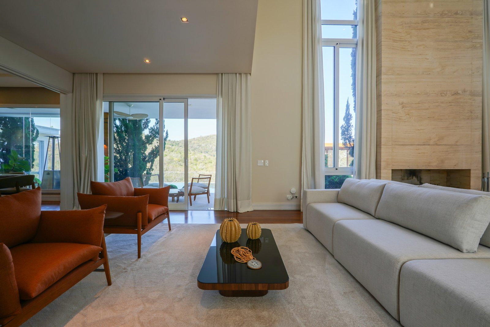 Family room com lareira em travertino Romano, vista para jardim e área de preservação