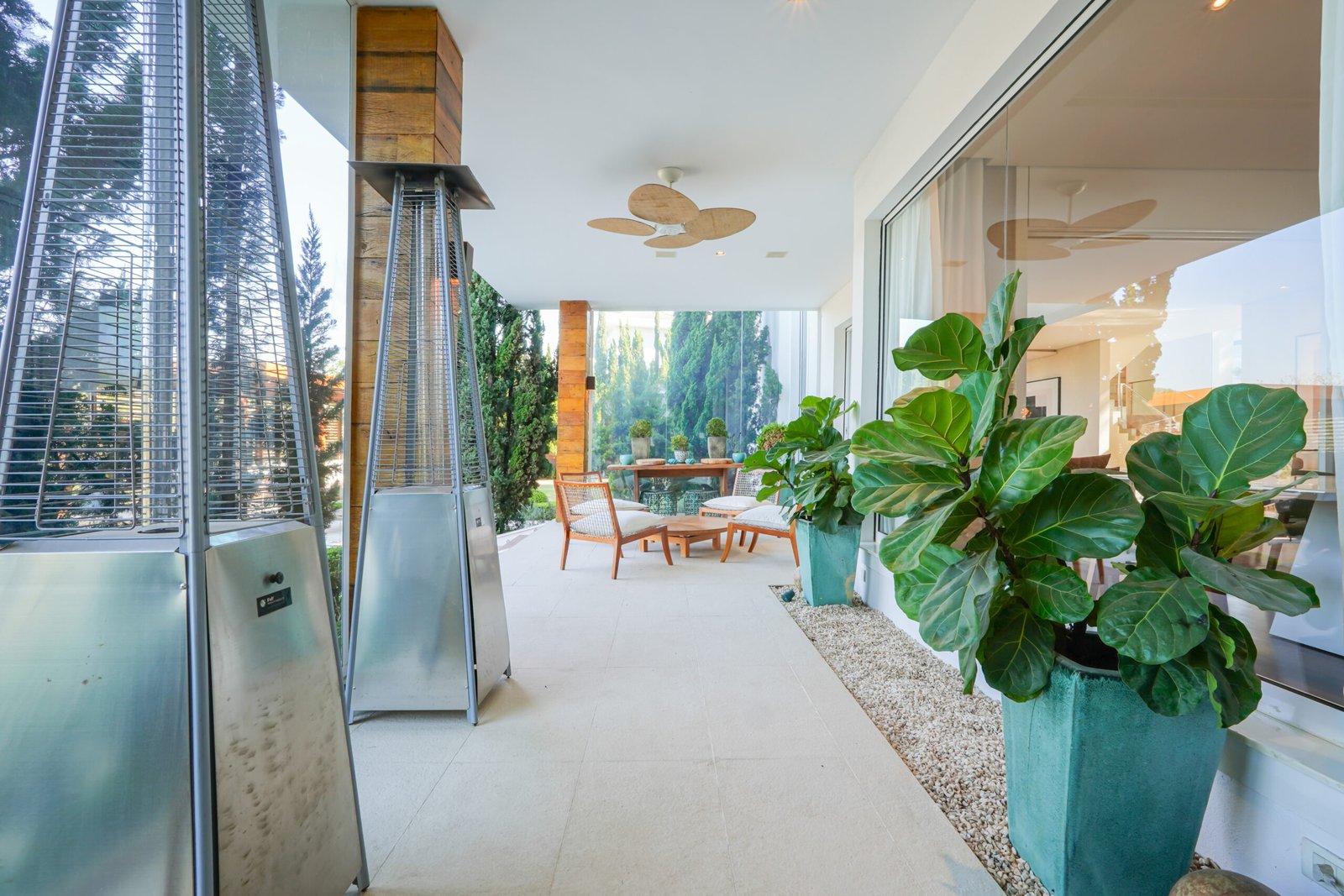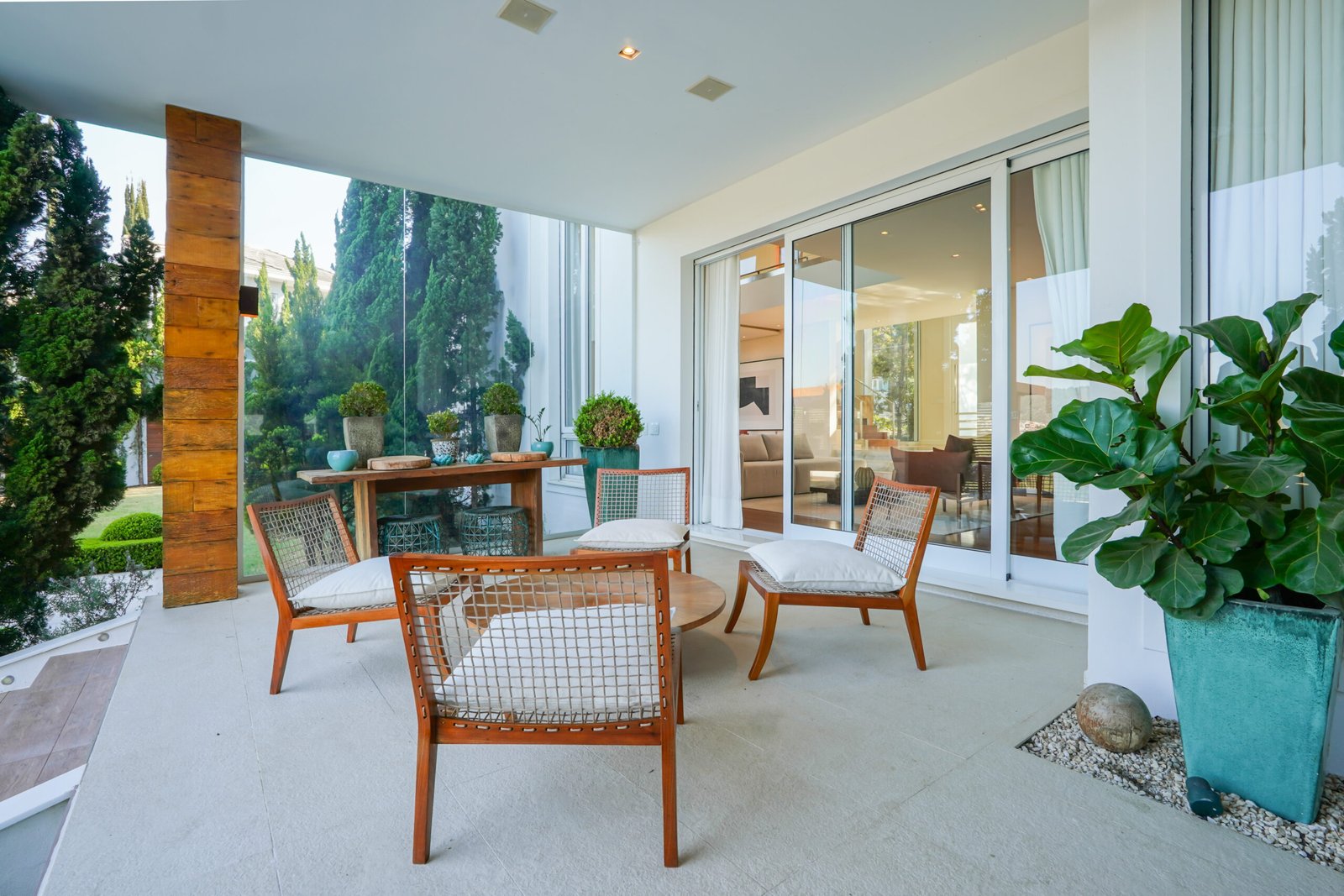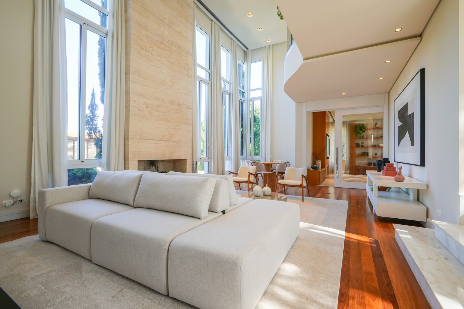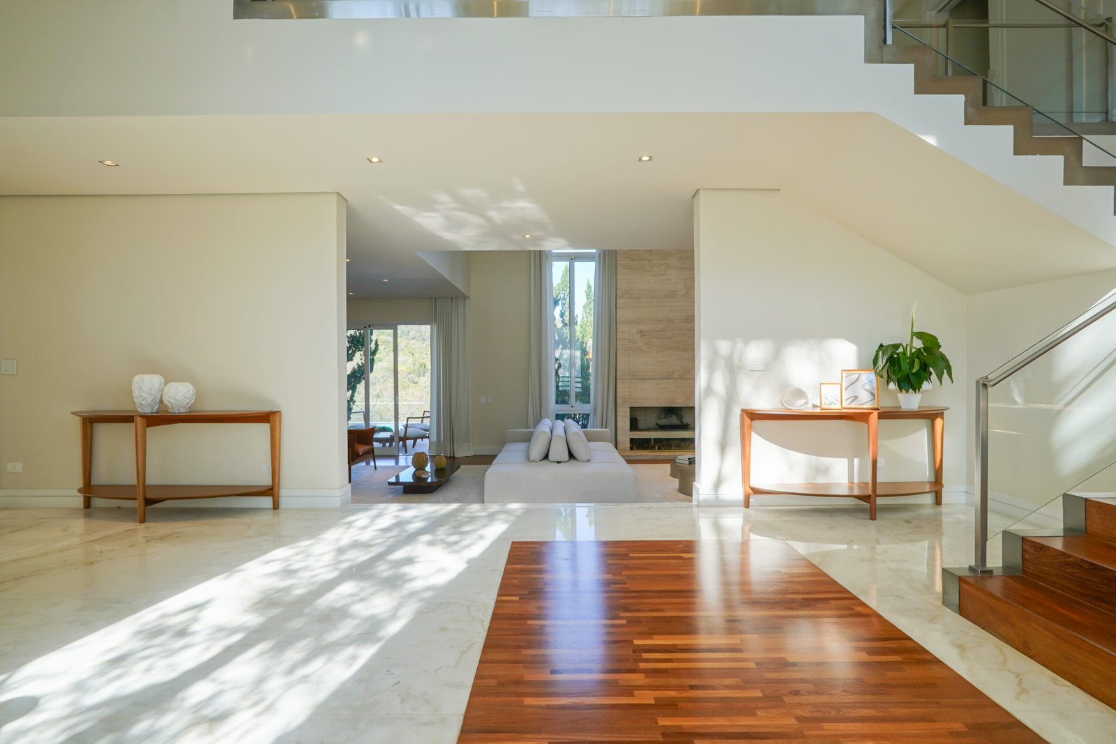 Family room com lareira em travertino Romano, vista para jardim e área de preservação