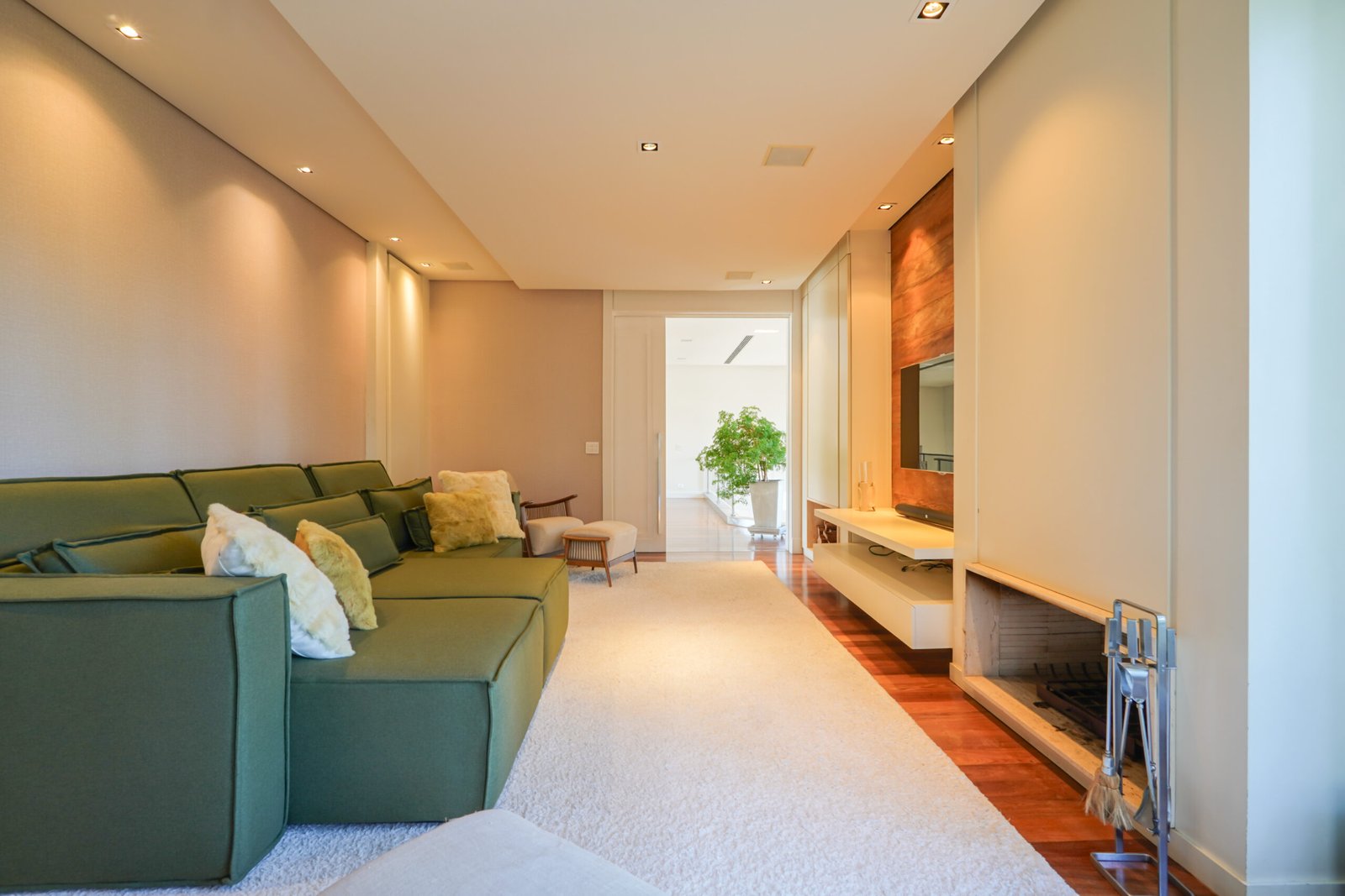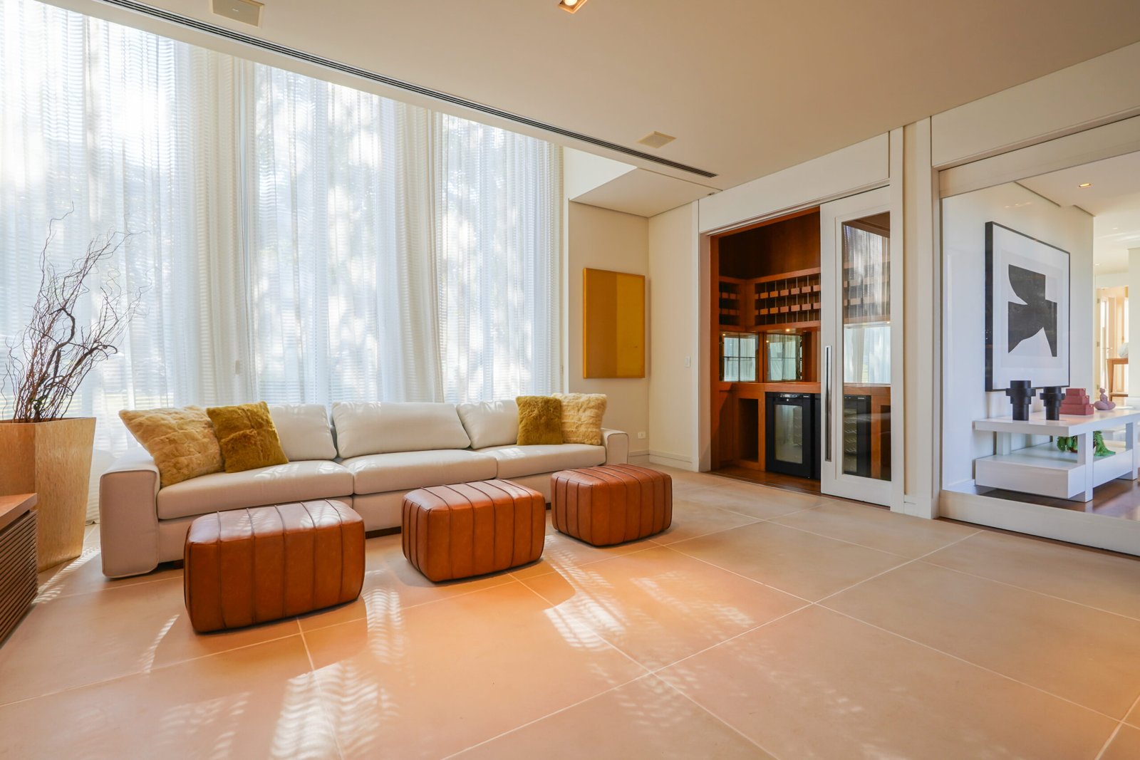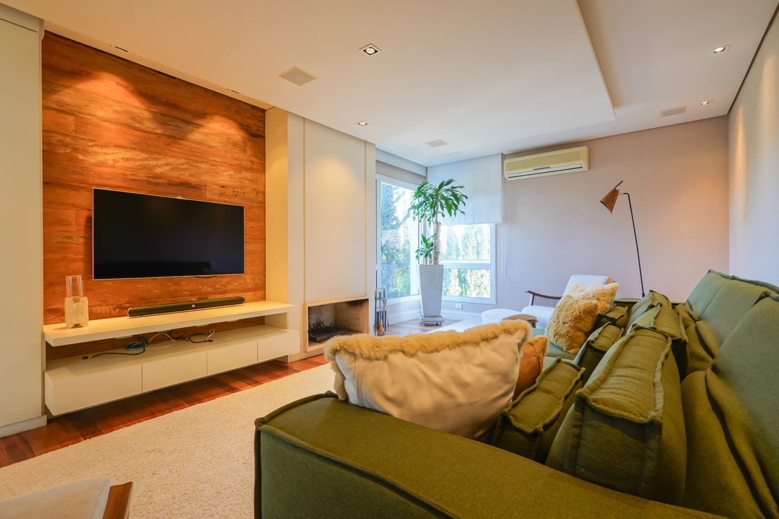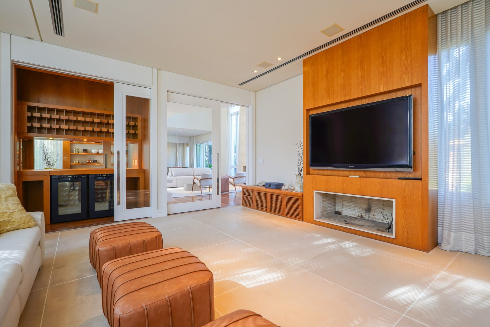 Sala com adega e lareira integrada ao living
