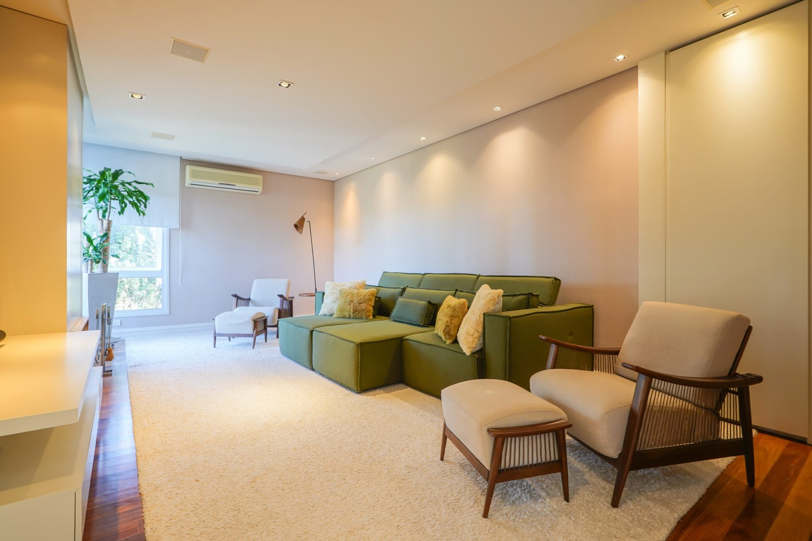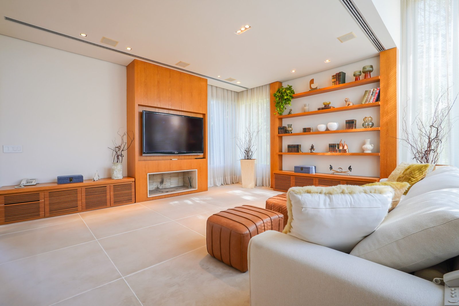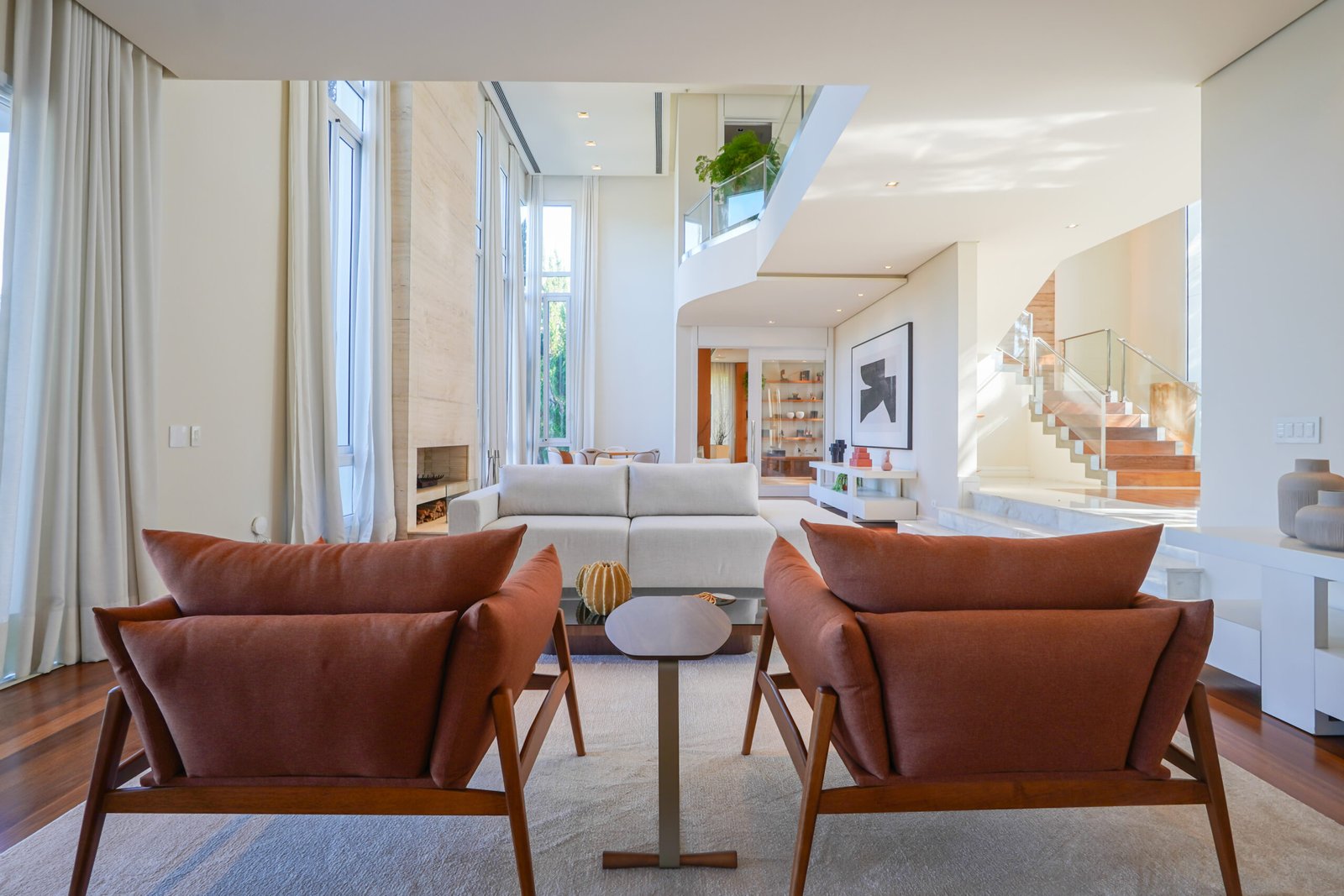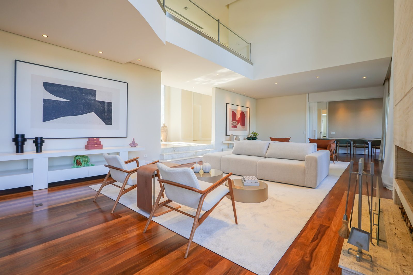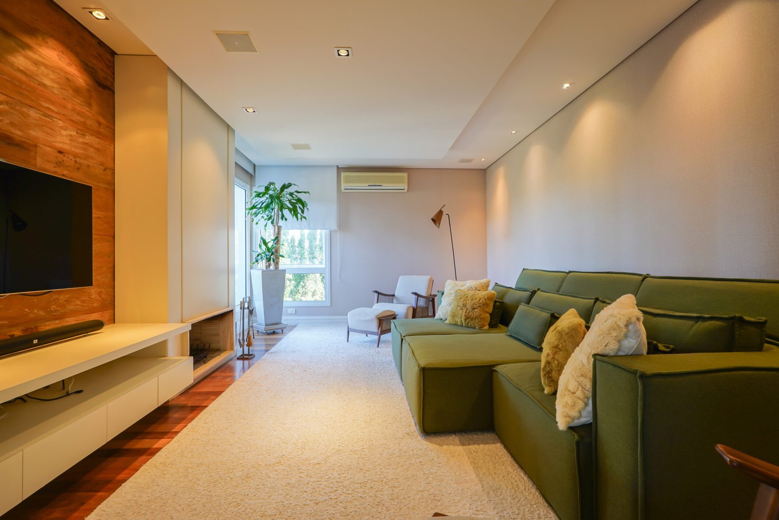 Sala com adega e lareira integrada ao living