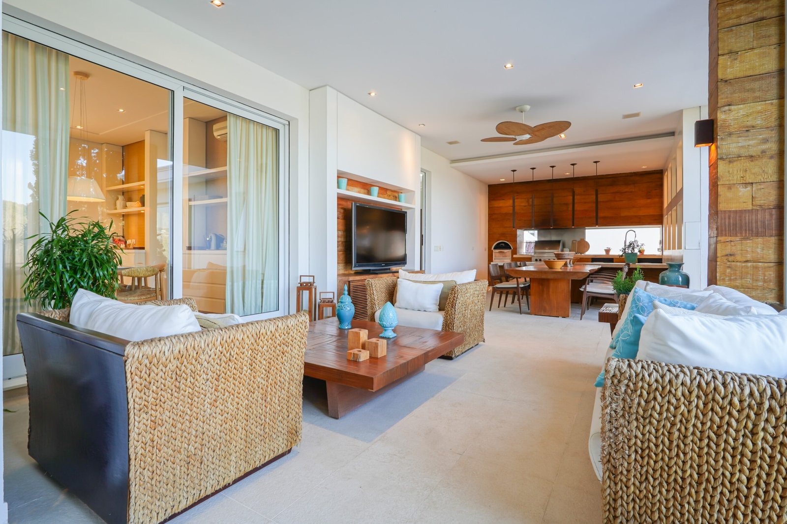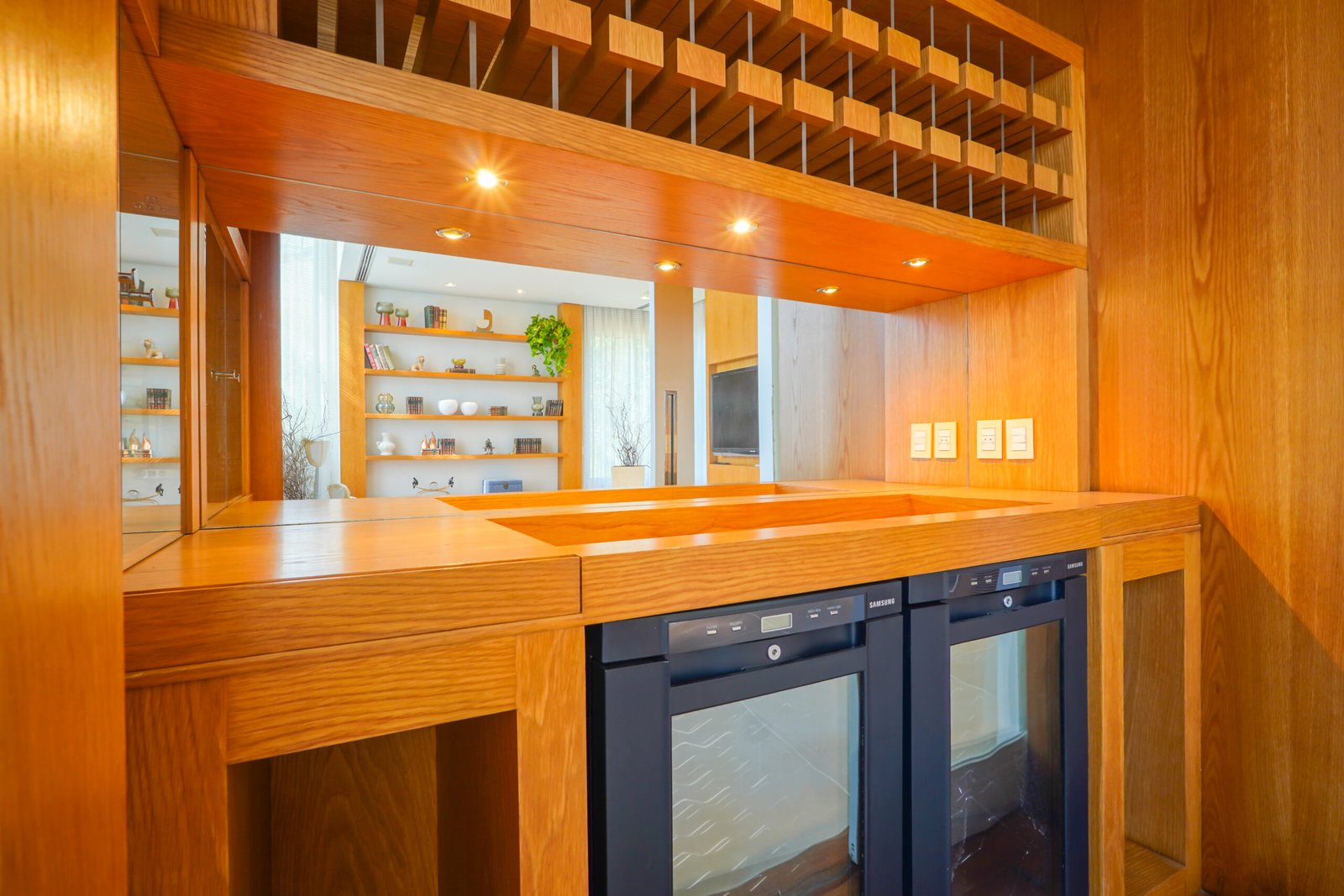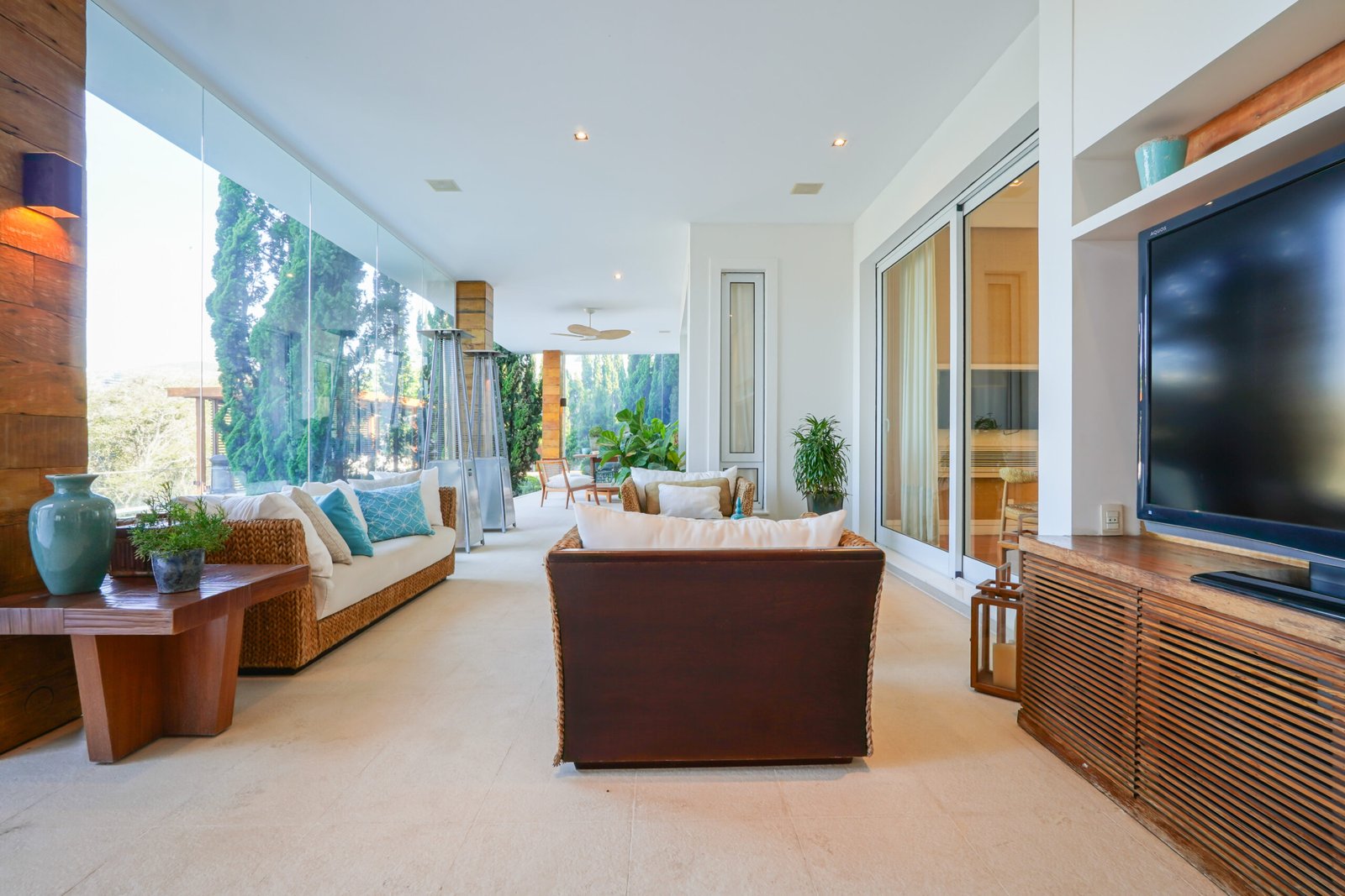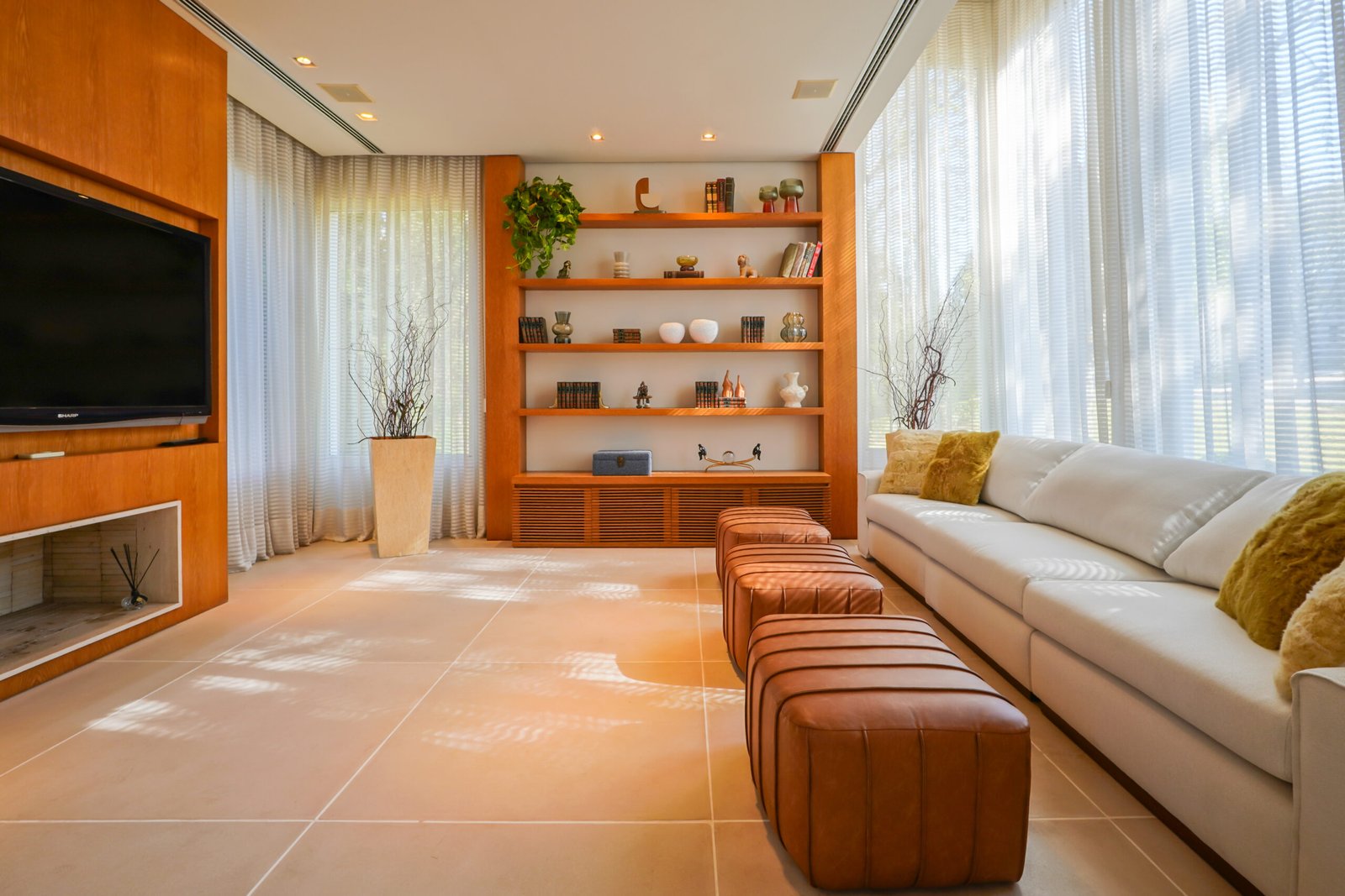 Sala com adega e lareira integrada ao living