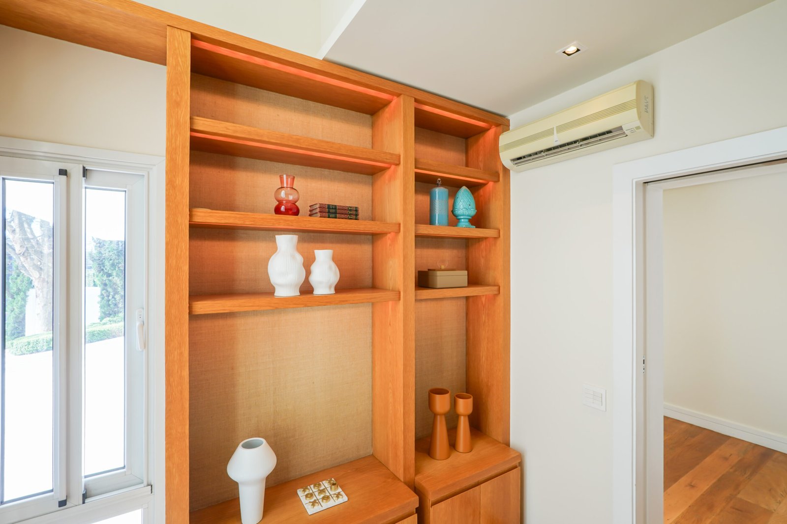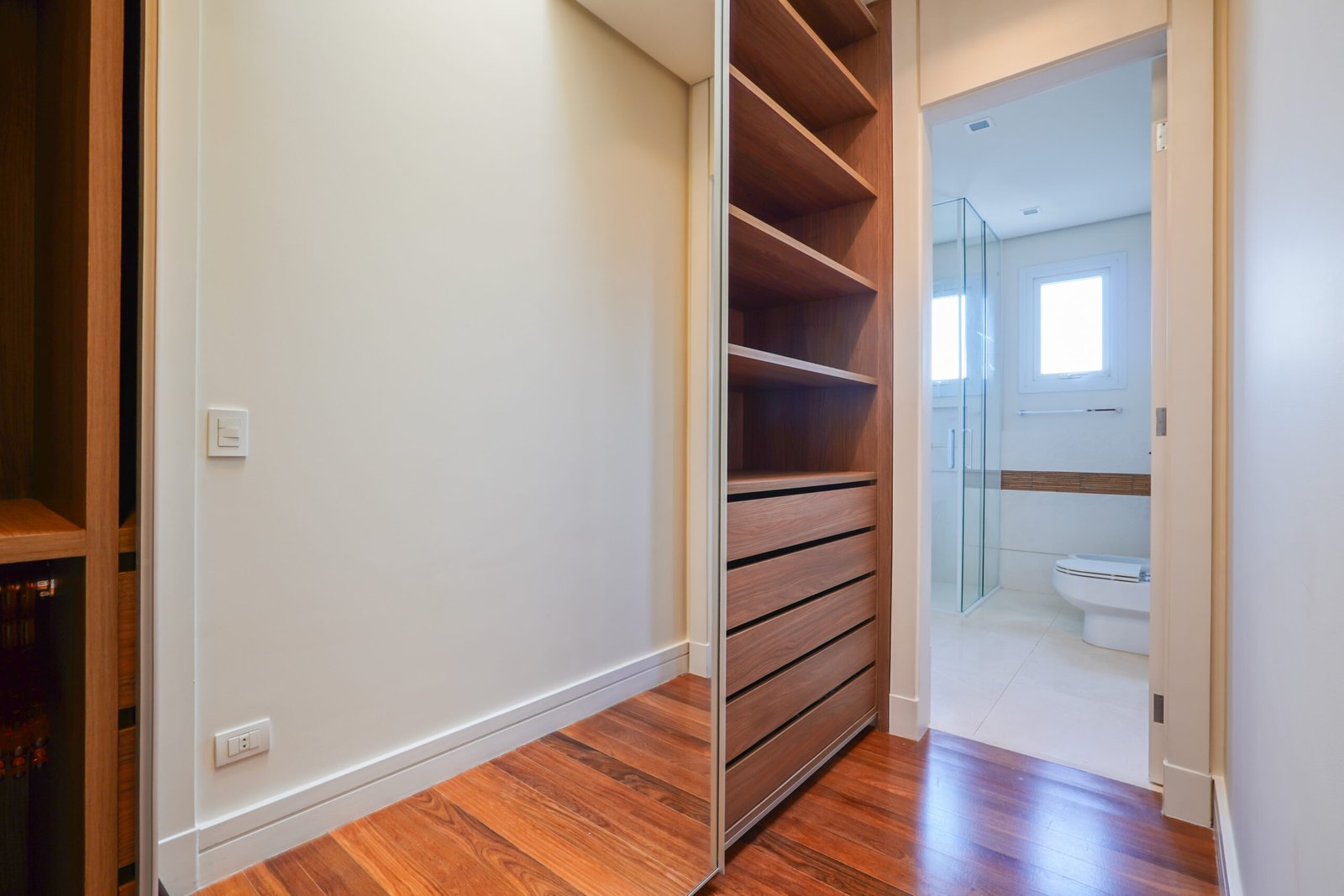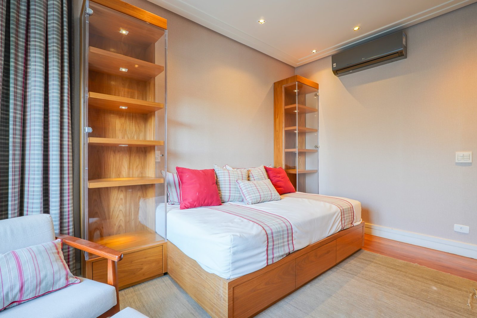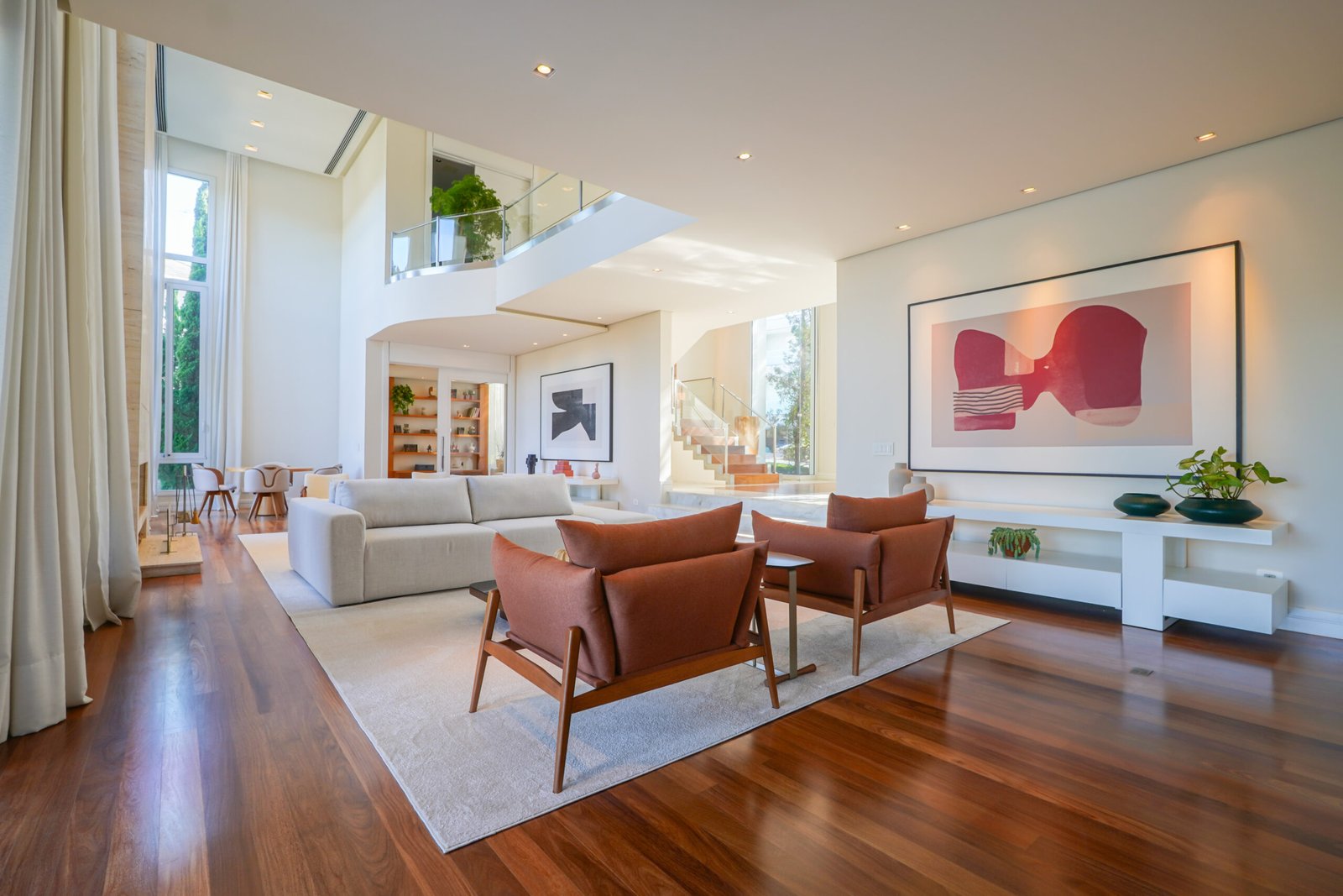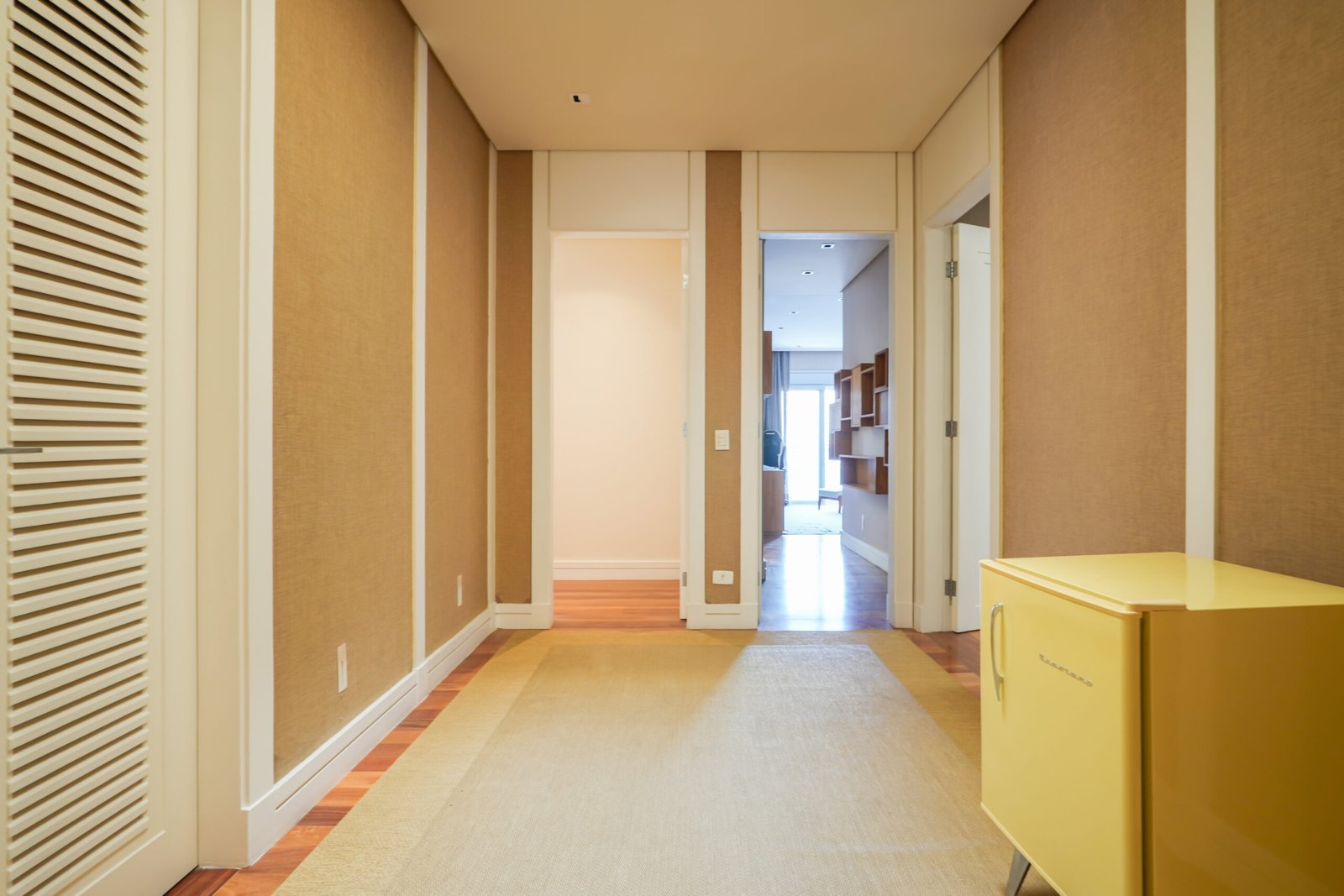 Sala com adega e lareira integrada ao living