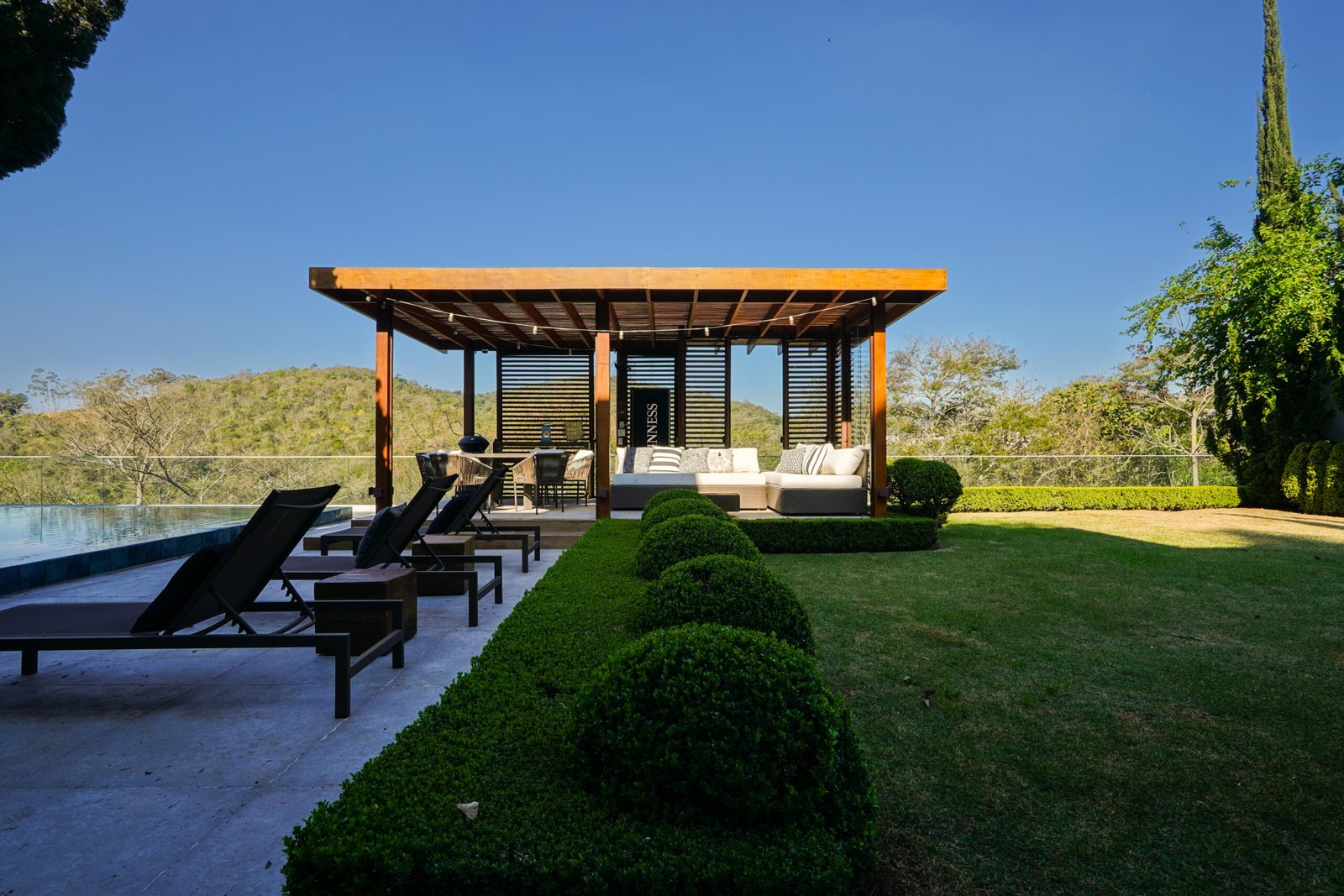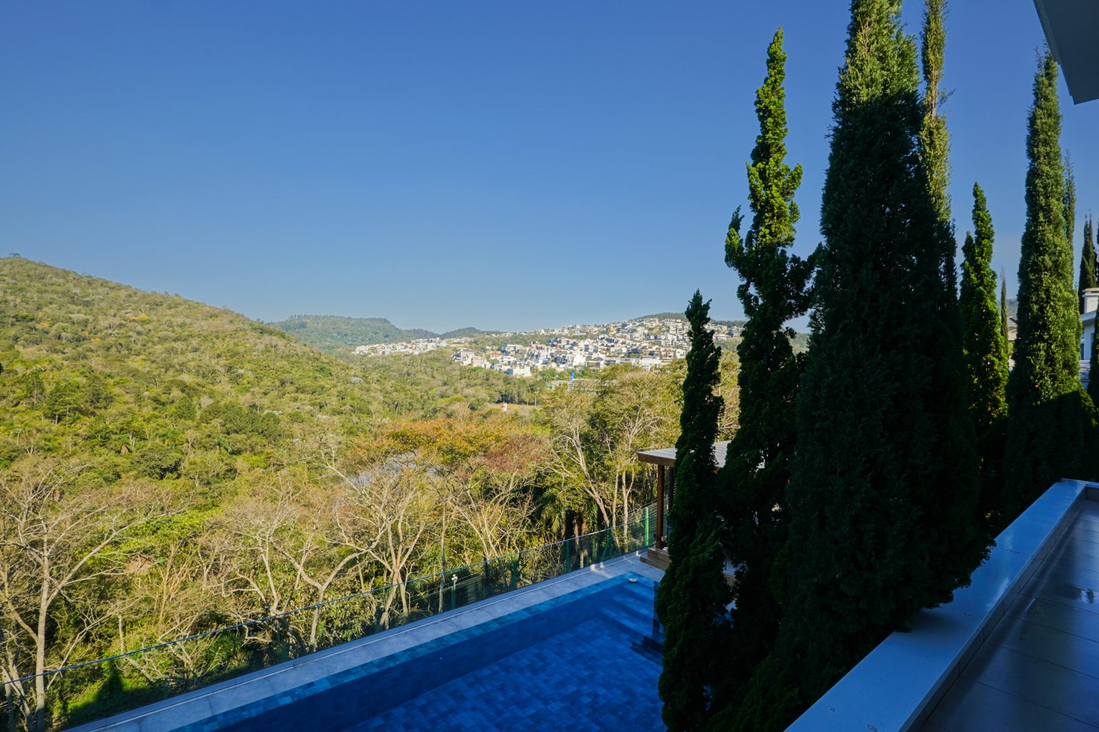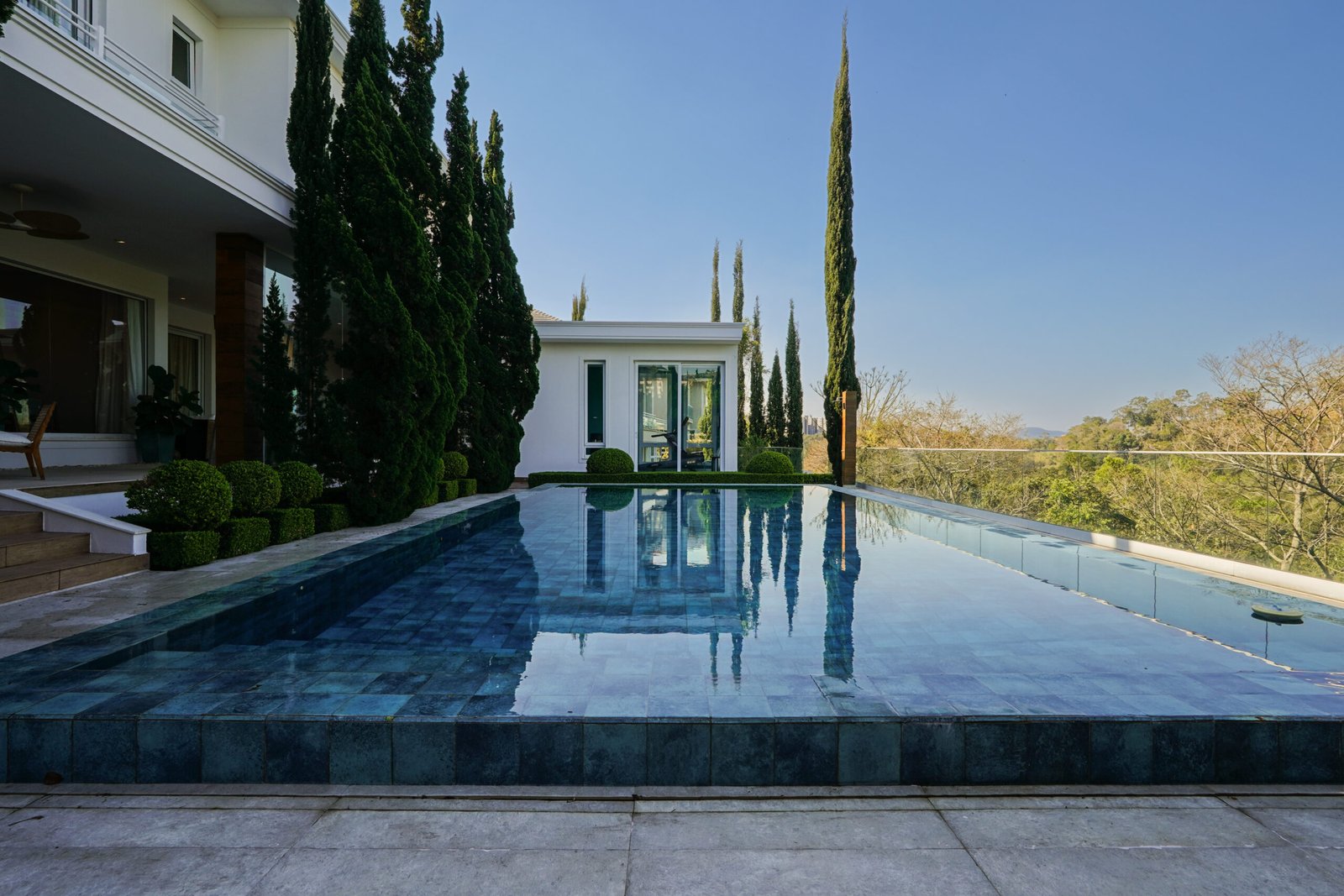 Piscina de borda infinita com vista para área de preservação e trocador de calor