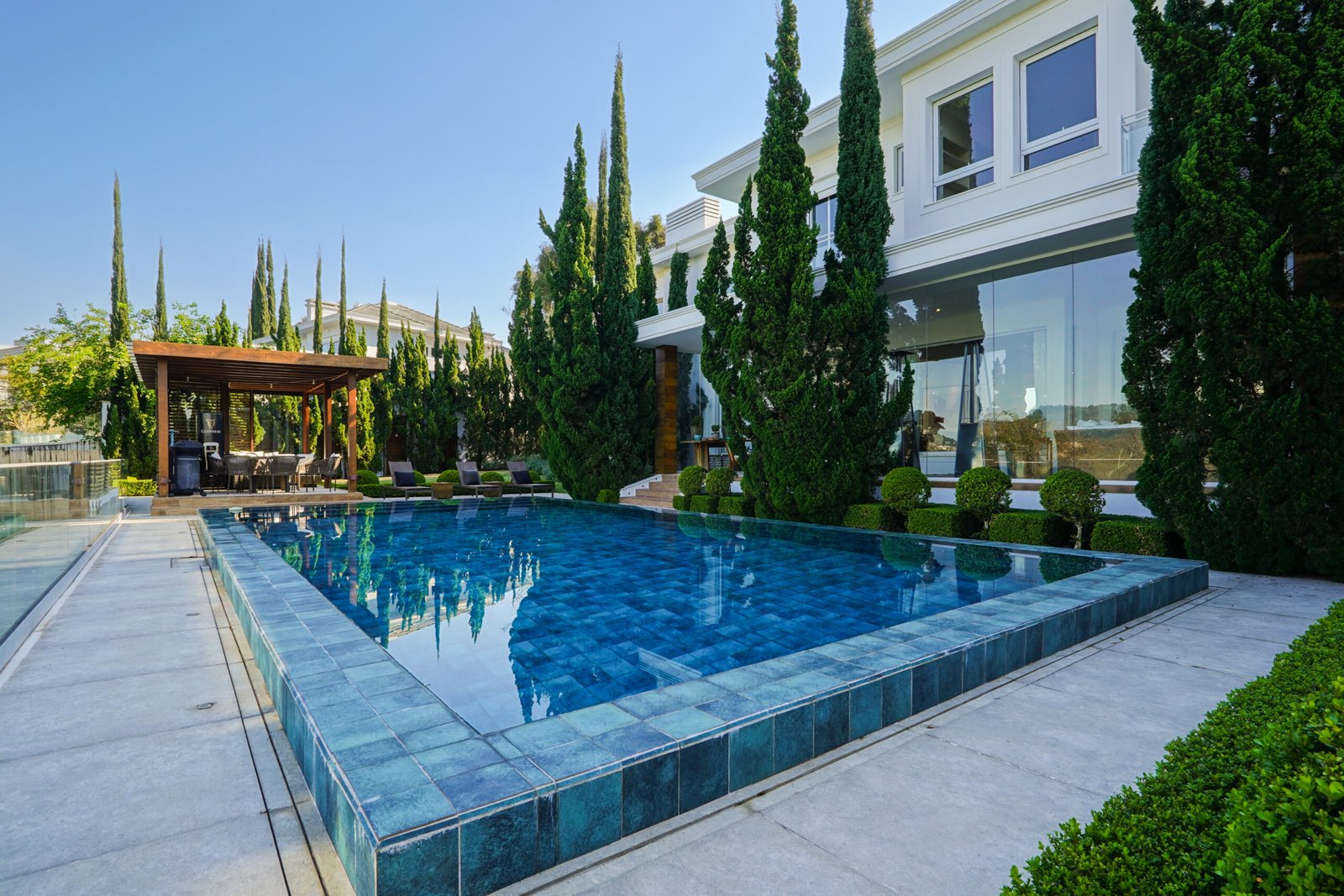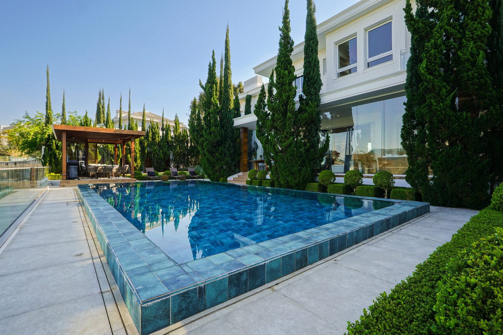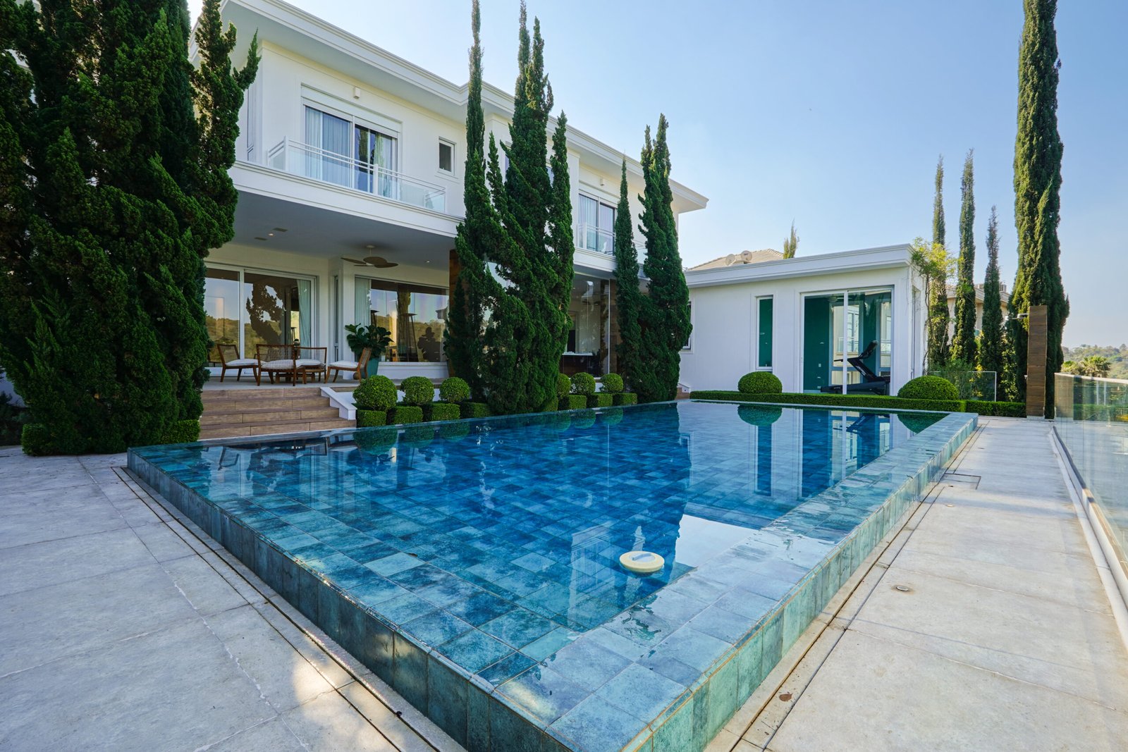 Piscina de borda infinita com vista para área de preservação e trocador de calor