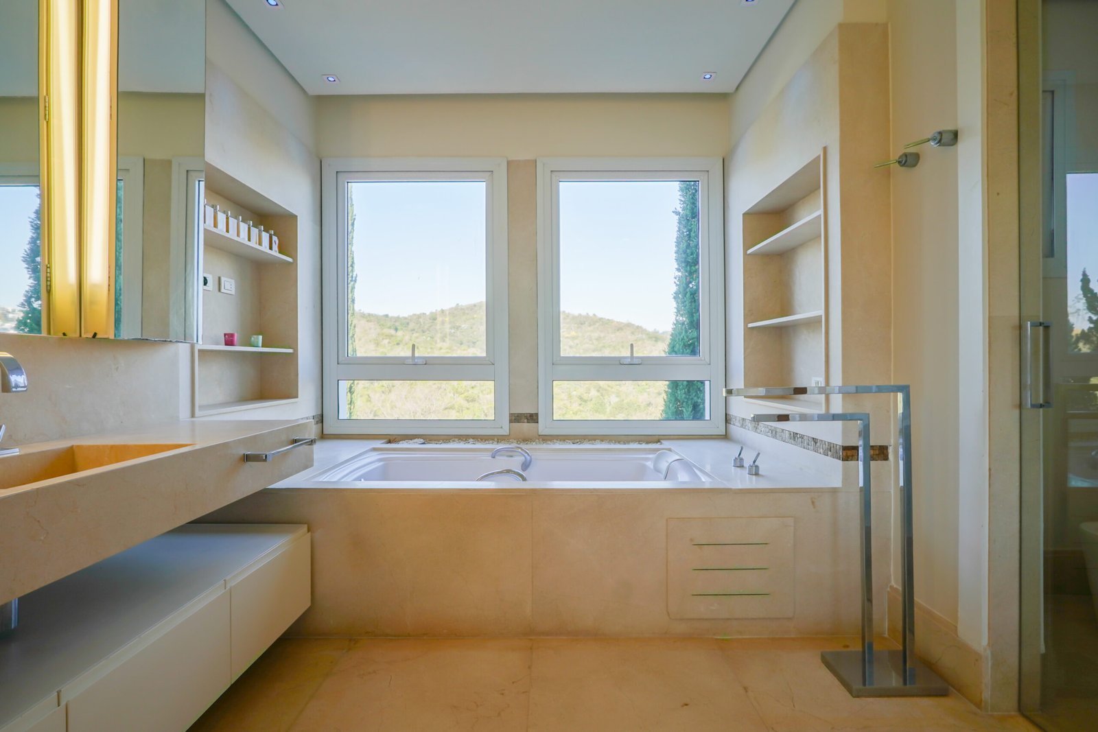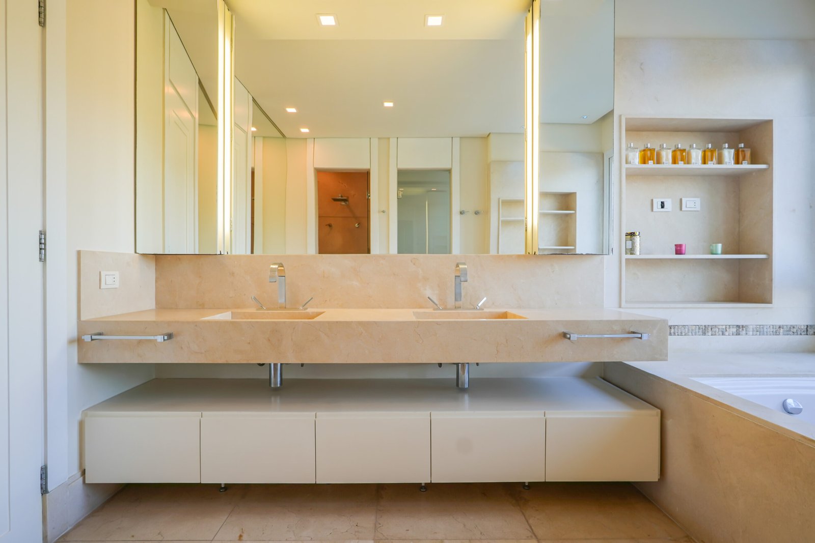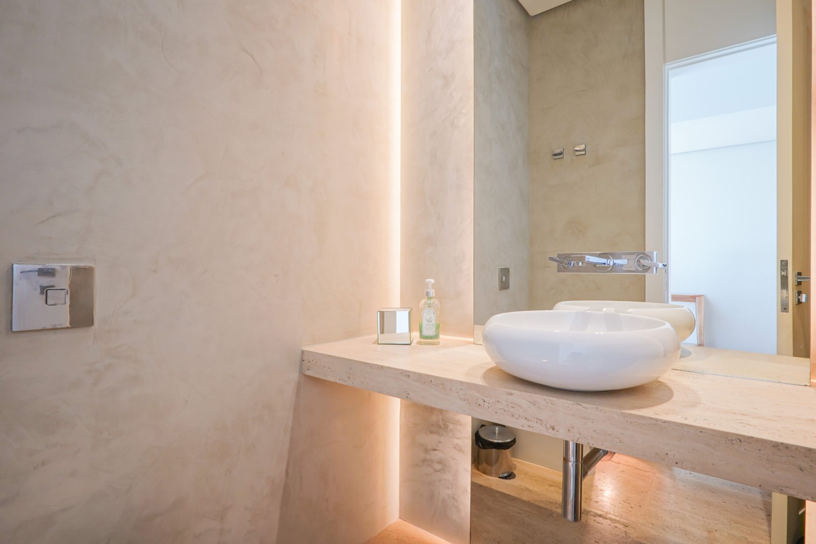 Lavabo com bancada e piso em Travertino Romano
